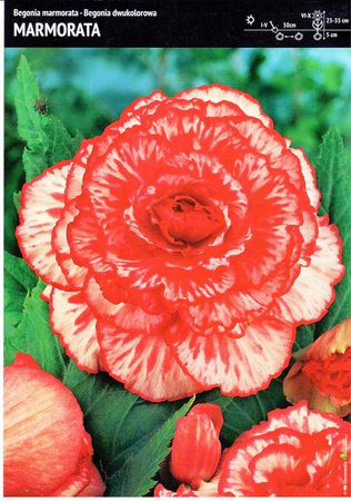 Begonia Dwukolorowa Marmorata to przepięknie kwitnąca roślina o sercowatych liściach, dorastająca do około 20-30 cm wysokości. Długo kwitnie – od czerwca aż do pierwszych przymrozków, a jej kwiaty przypominają małe różyczki. Odmiana Marmorata rozkwita w niesamowitej barwie – czerwieni przeplatanej z bielą w nietypowy sposób. Idealnie nadaje się na ozdobę ogrodu, balkonu czy tarasu.